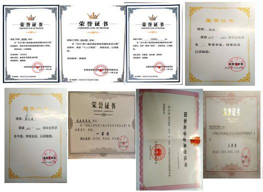 在校期间努力学习,在本专业成绩突出,综合测评连续两年全专业第一。曾获中国电信奖学金,国家励志奖学金2次、校一等奖学金2次。获校级文明宿舍3次、校级学习型宿舍2次。曾获校级优秀学生干部标兵,校级优秀共青团干部、校级优秀共青团员、校级三好学生等荣誉称号。作为学生干部,积极组织或参与校内外学术类、文体类、志愿服务类活动并获院级“优秀工作者”奖项50余次;大学生创新创业比赛国家级立项、挑战杯校级三等奖、“三下乡”校级重点团队3次;获湖南省企业模拟经营大赛优秀志愿者、抗疫志愿活动县级优秀工作者、校级优秀志愿者3次、参与大小志愿服务活动多次。