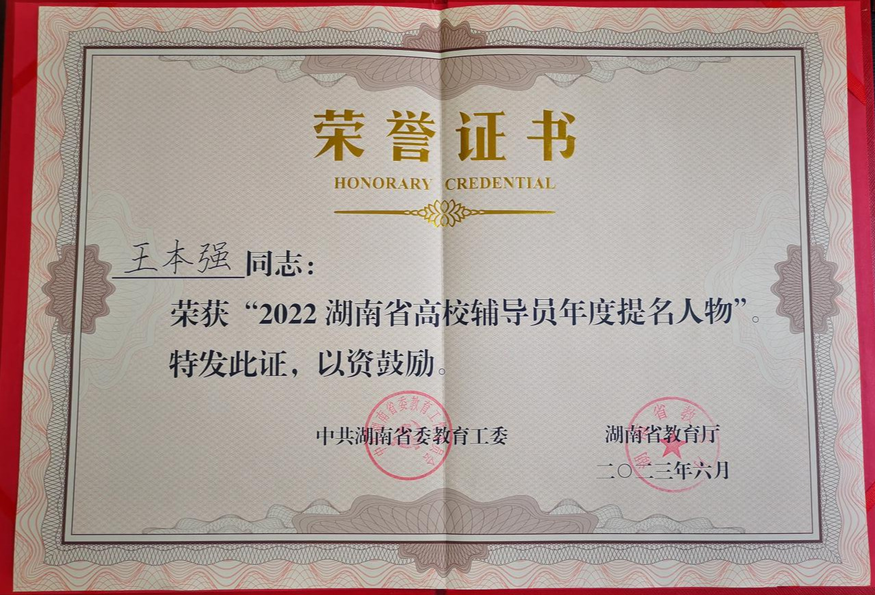 王本强获“湖南省高校辅导员年度提名人物”荣誉称号