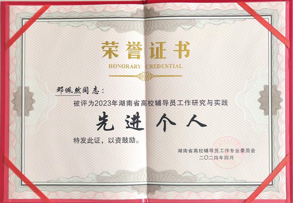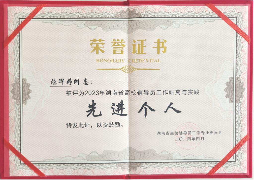 “湖南省高校辅导员研究与实践先进个人”荣誉证书