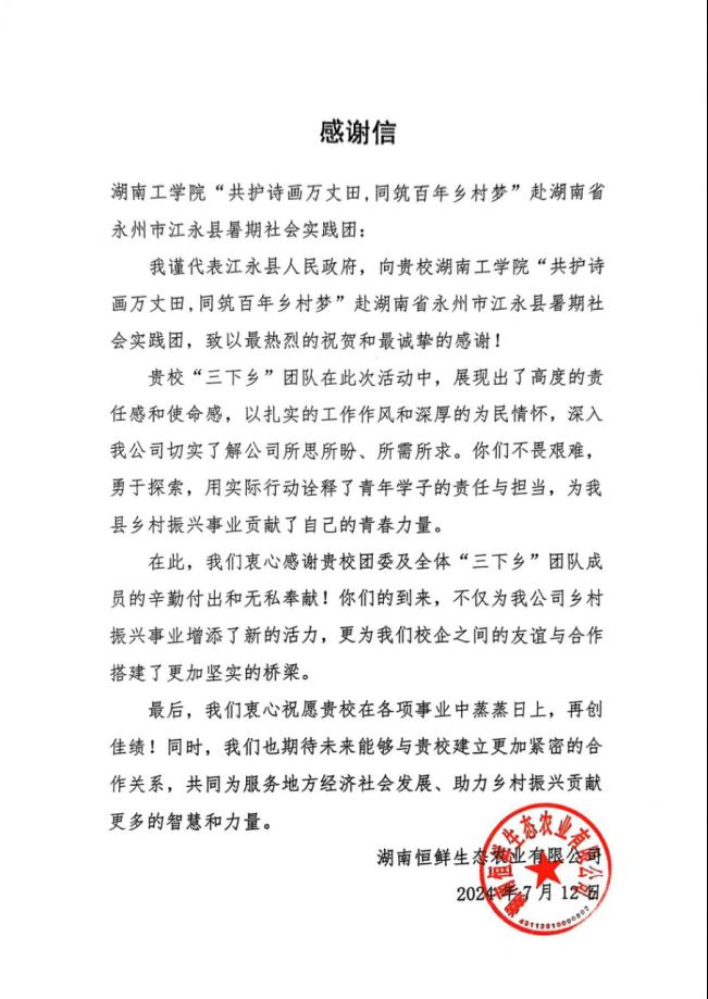 图 11江永县恒鲜记生态农业公司给予团队感谢信