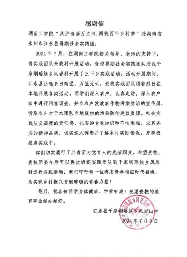 图 9江永县凤岩山村委给予团队感谢信