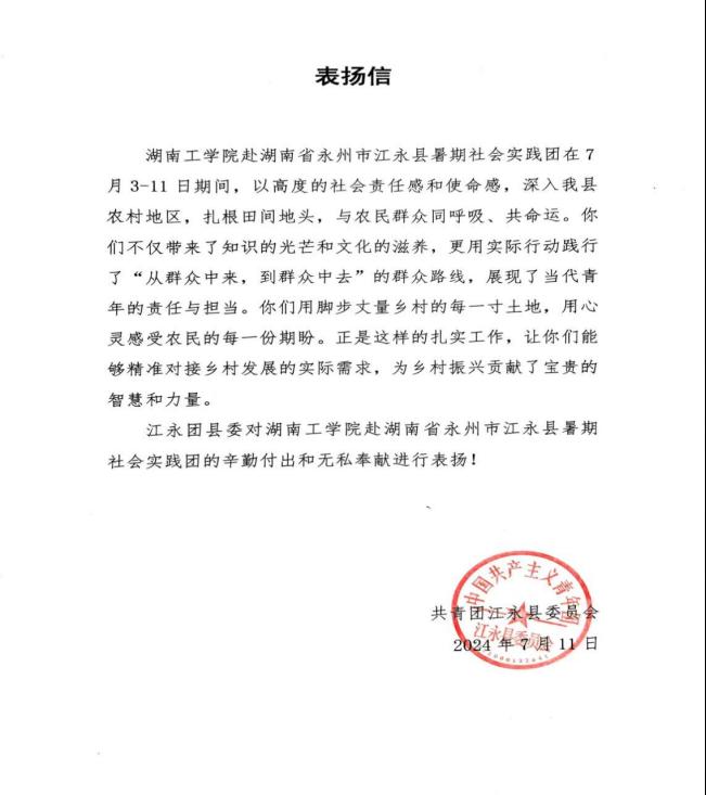 图 8江永县团县委给予团队表扬信